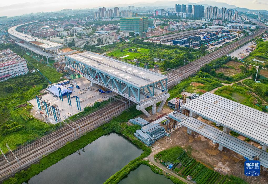 8月31日,莞番高速上跨广深铁路主桥转体完成(无人机照片)。