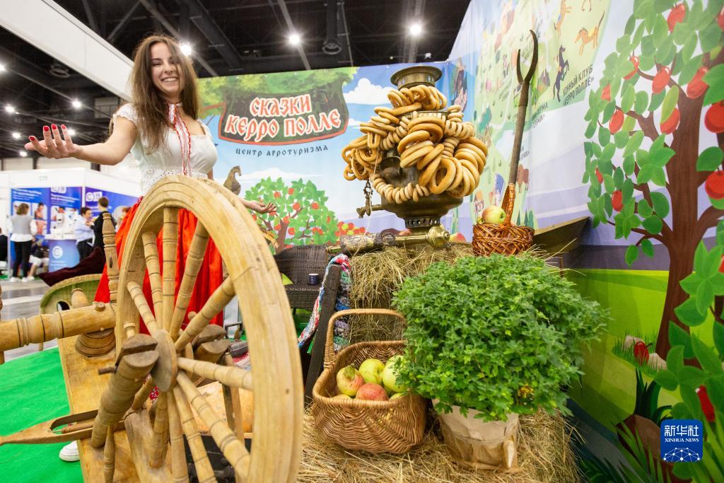 8月31日,一名工作人员在俄罗斯圣彼得堡第32届国际农业工业展上推介产品。