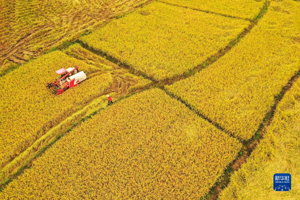 8月31日,湖南省常宁市罗桥镇阳家村村民驾驶收割机在收割水稻(无人机照片)。