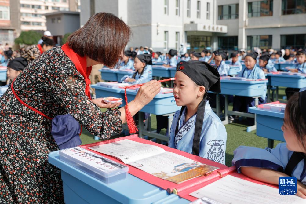 9月1日,在甘肃省兰州市七里河区第二小学,老师在为一年级新生点朱砂启智。