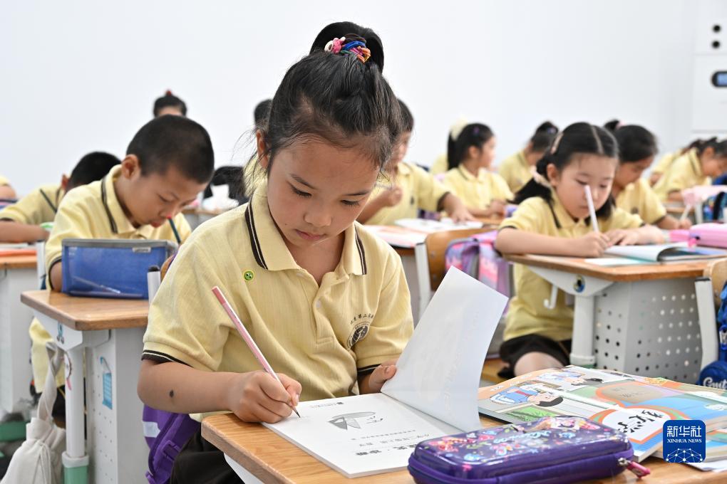 9月1日,北京第二实验小学涭水河分校二年级1班的学生在新课本上写上自己的名字。