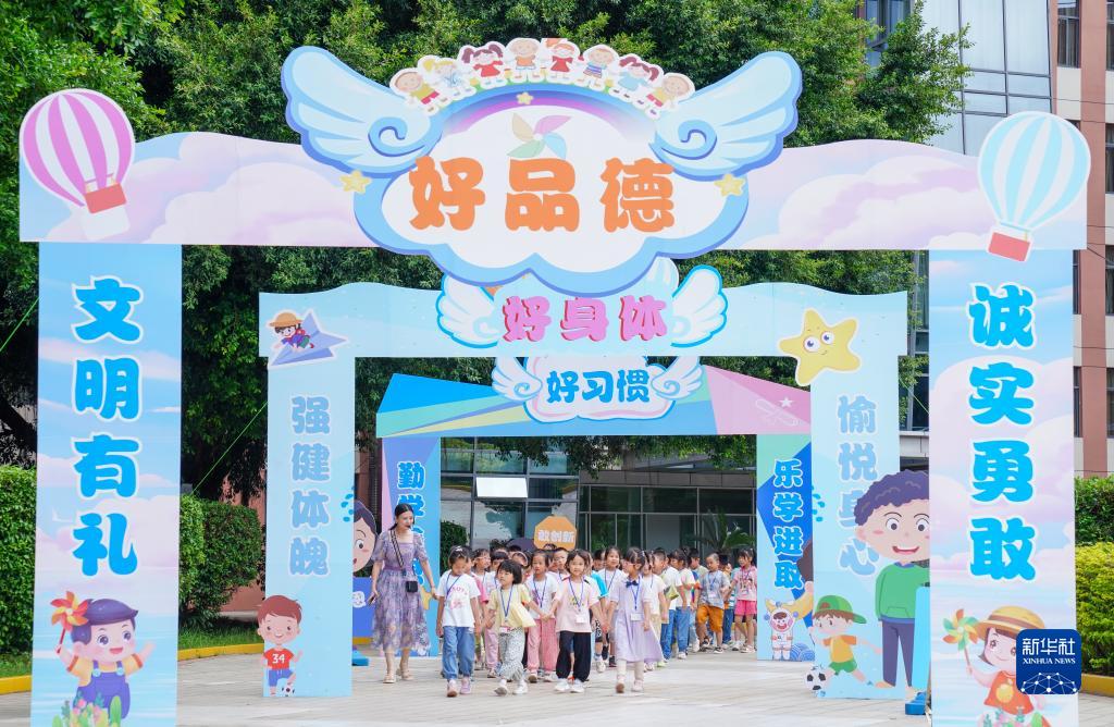 9月1日,福建省福州金山小学老师带领一年级新生熟悉校园。