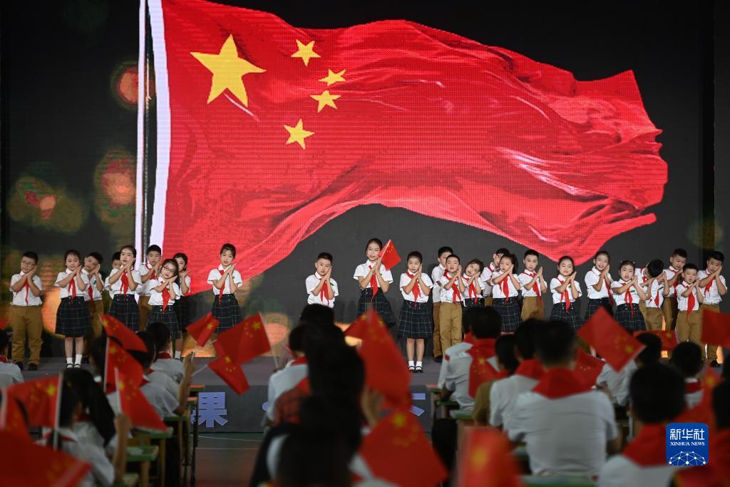 9月1日,浙江省宁波市奉化区锦屏中心小学的学生在活动上表演童声合唱《国旗国旗真美丽》。