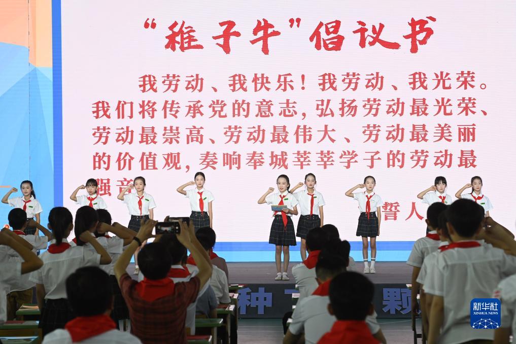9月1日,浙江省宁波市奉化区锦屏中心小学的学生在“开学第一课”上宣读劳动倡议书。