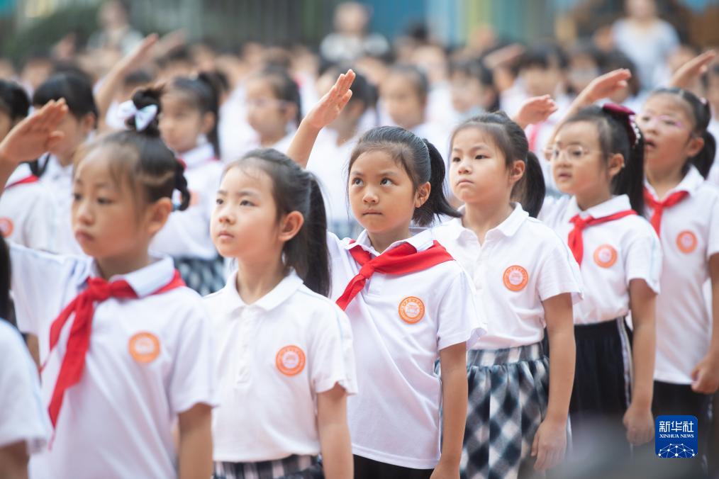 9月1日,湖北省武昌实验中学沙湖学校学生在升旗仪式上。