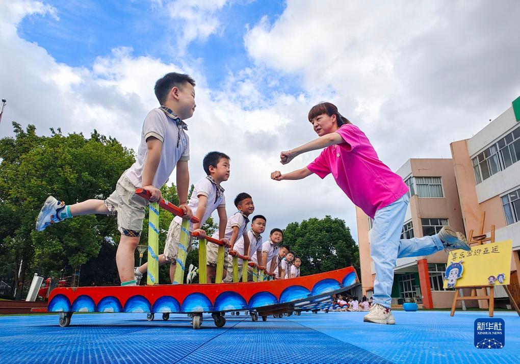 9月1日,浙江省宁波市镇海区澥浦镇中心幼儿园小朋友跟随老师学习当地民俗运动“旱地泥艋”。