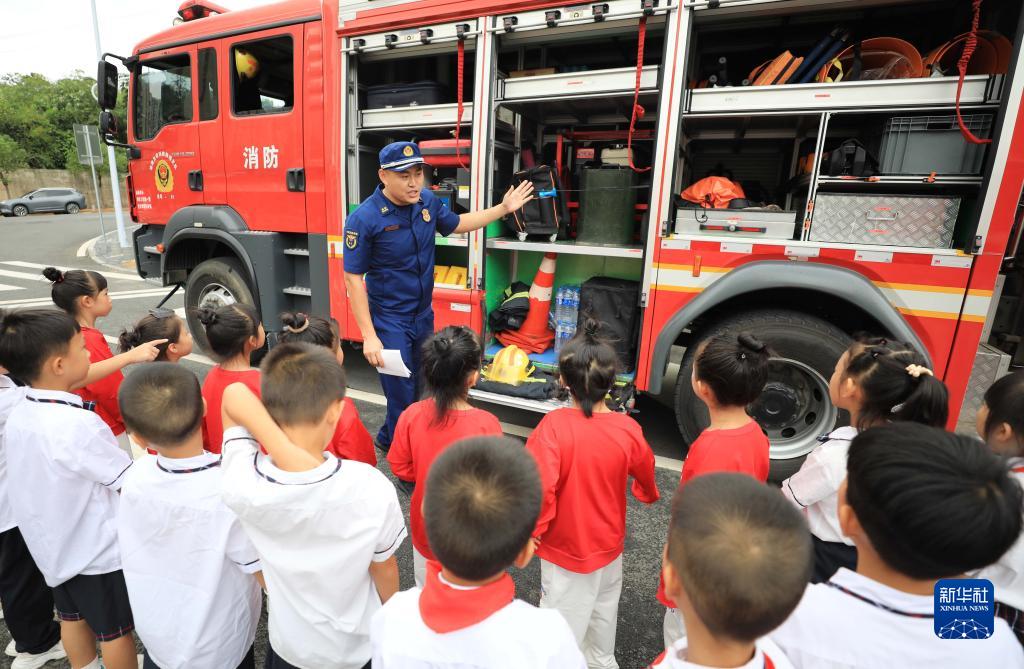 9月1日,在福建省龙岩市第二实验小学,新生在消防员的讲解下了解消防车辆器材知识。
