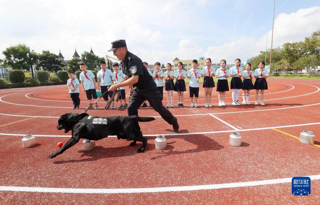 9月1日,在浙江省湖州市德清县禹越镇徐家庄中心小学“开学第一课 禁毒进校园”宣传活动上,德清县公安局禹越派出所一只缉毒犬在进行嗅毒表演。