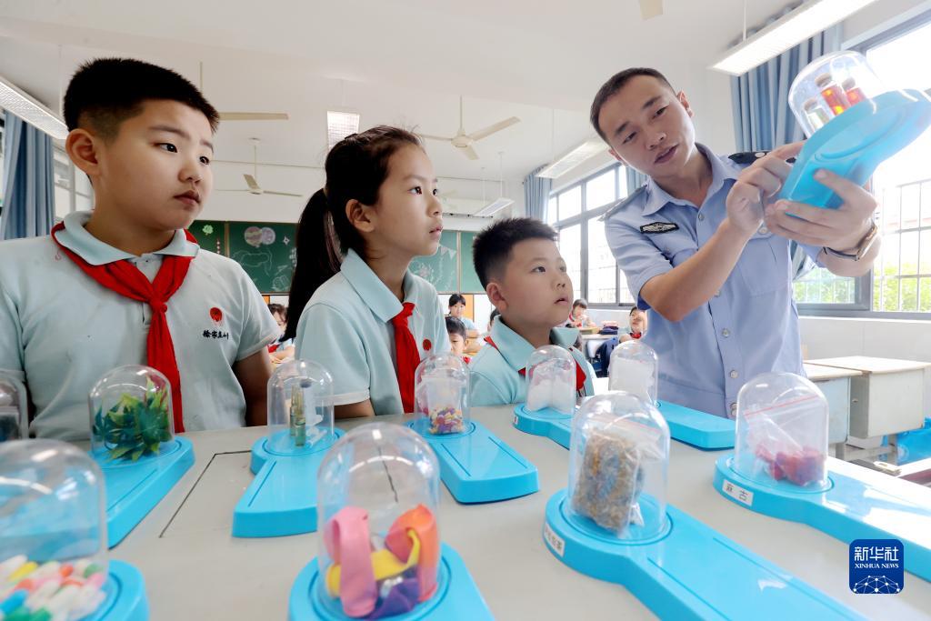 9月1日,浙江省湖州市德清县公安局禹越派出所民警在德清县禹越镇徐家庄中心小学为学生讲解毒品危害。