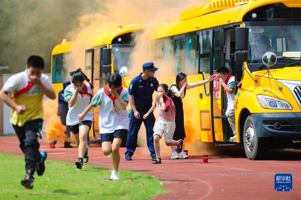 9月1日,在浙江省湖州市德清县武康街道东风小学,学生在消防员的指导下进行校车应急逃生演练。