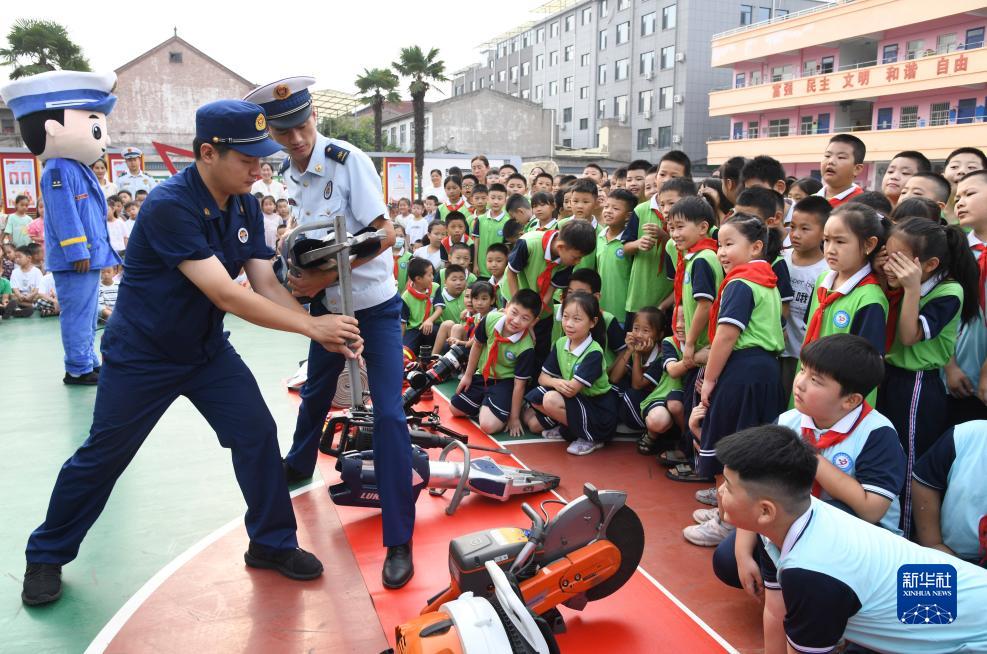 9月1日,在河南省济源市文昌路小学,济源市消防救援支队消防员为学生介绍消防救援设备。