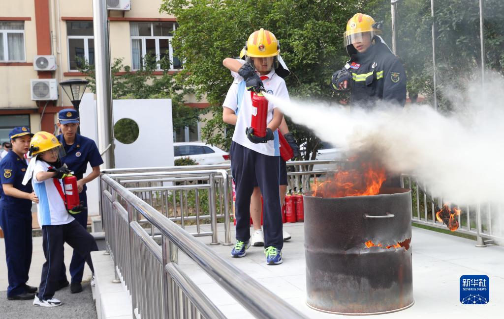 9月1日,上海市长宁区消防救援支队的消防员在辖区内姚连生中学指导学生使用灭火器灭火。