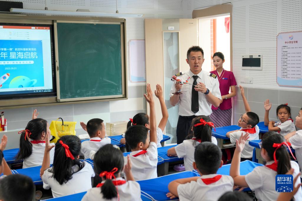9月1日,在全国航空特色学校重庆市九龙坡区铁路小学开学第一课的课堂上,来自重庆航空的飞行员李蒙邑用飞机模型向学生们讲解飞行原理。