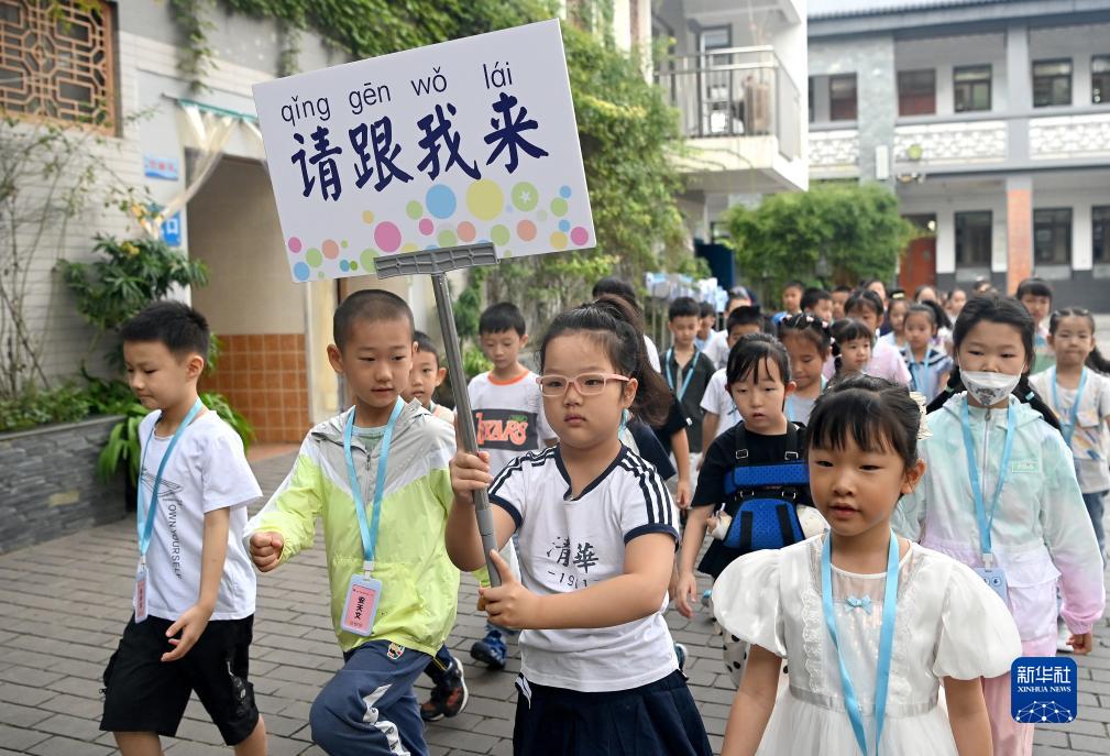 9月1日,陕西省西安市新城区后宰门小学一年级的学生在熟悉校园。