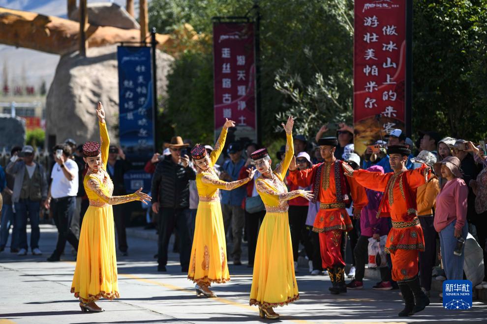 在新疆塔什库尔干塔吉克自治县帕米尔旅游区游客服务中心,文工团演员跳舞欢迎游客(8月29日摄)。
