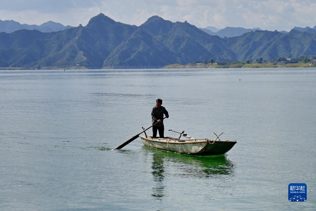 8月30日,衡丙三在潘家口水库上划船行驶,准备巡查长城。