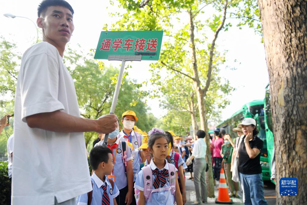 9月1日,在北京市丰台区第一小学外,乘坐通学公交车到达的学生在老师的指引下排队等候入校。