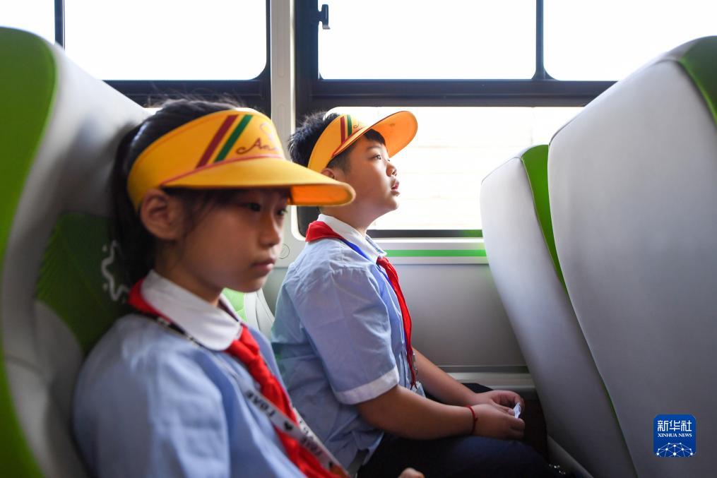 9月1日,两位北京市丰台区第一小学的学生乘坐通学公交车上学。