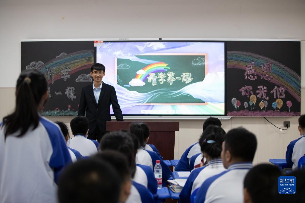 9月1日,在哈尔滨市延寿县第四中学,一名教师在开学第一课上讲述校园重建的经过。