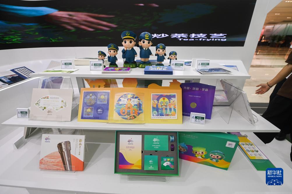 这是主媒体中心序厅内展示的各类亚运主题邮票、明信片等(9月1日摄)。