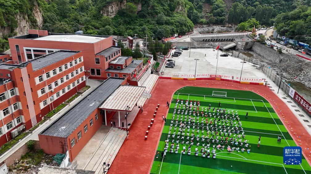 9月1日,在北京市房山区霞云岭乡霞云岭中心小学,老师和学生在修缮一新的操场上参加开学典礼(无人机照片)。