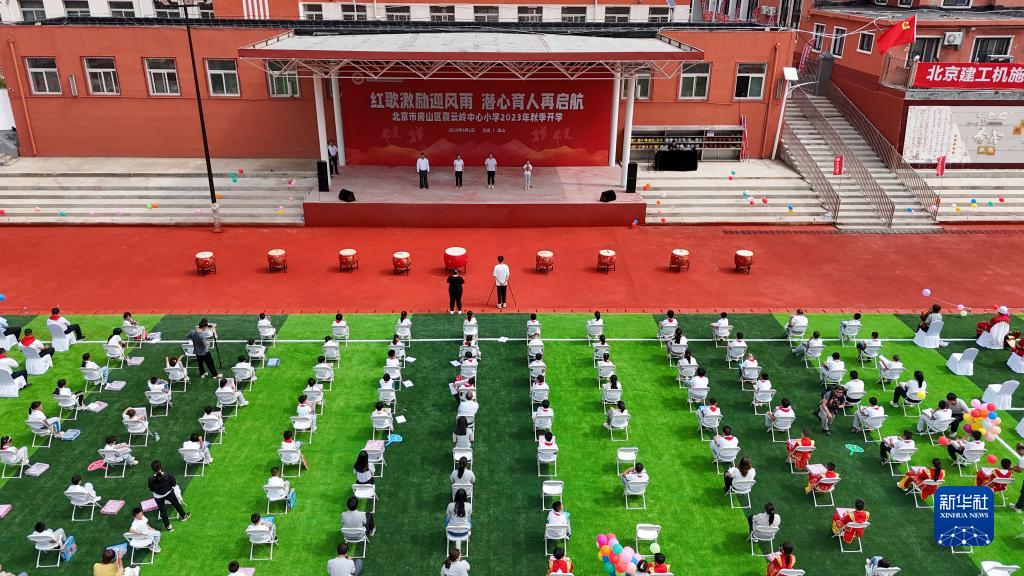 9月1日,在北京市房山区霞云岭乡霞云岭中心小学,老师和学生在修缮一新的操场上参加开学典礼(无人机照片)。