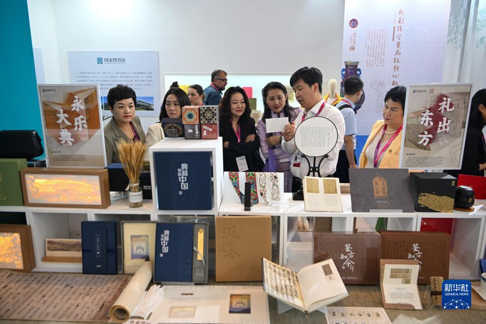 9月1日,参观者在第十三届中国旅游产业博览会中国国家图书馆展区挑选文创产品。