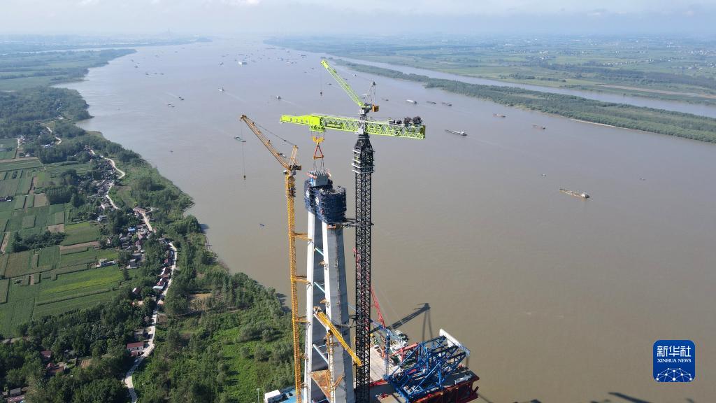 这是9月1日拍摄的中交二航局巢马城际铁路马鞍山公铁两用长江大桥南主塔首节段钢塔吊装现场(无人机照片)。