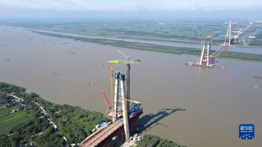 这是9月1日拍摄的中交二航局巢马城际铁路马鞍山公铁两用长江大桥南主塔首节段钢塔吊装现场(无人机照片)。