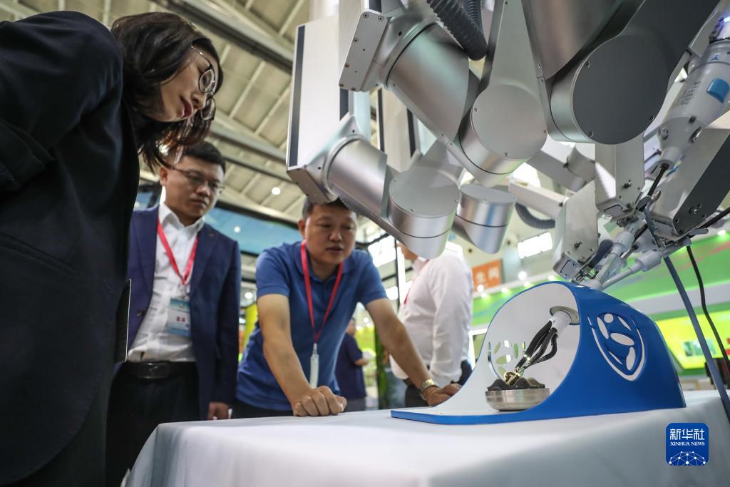 9月1日,参观者在第二十一届中国国际装备制造业博览会现场参观展出的腹腔内窥镜单孔手术系统。