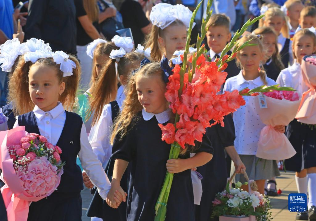 9月1日,学生在白俄罗斯首都明斯克一所学校参加开学典礼。