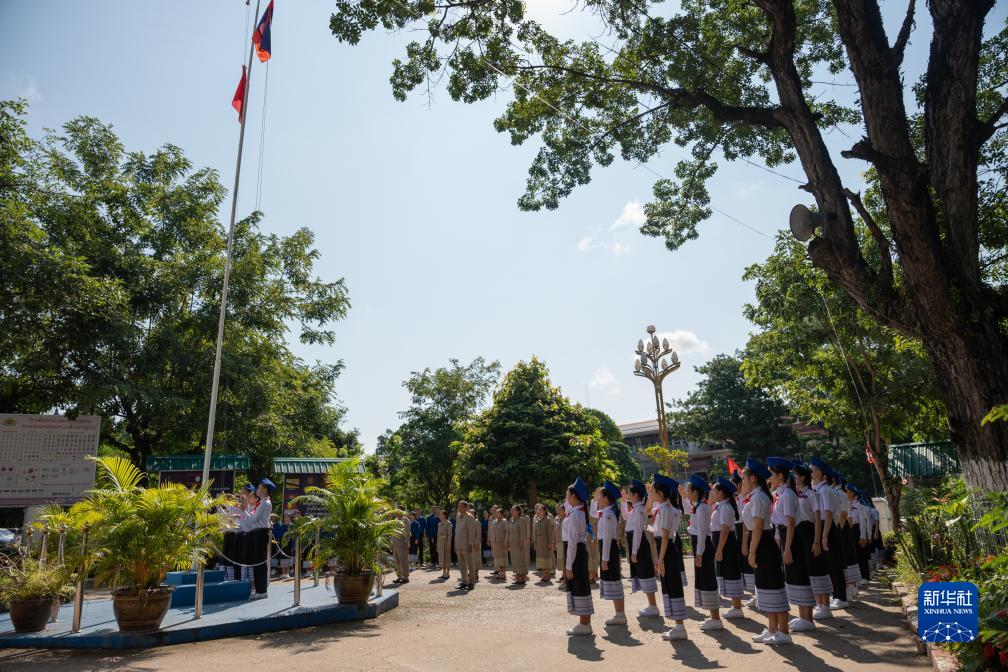 9月1日,学生们在老挝首都万象一所学校参加开学升旗仪式。