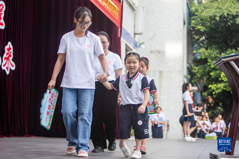 9月1日,在重庆育才实验学校华岩校区,豆豆在老师的引导下参加开学典礼。