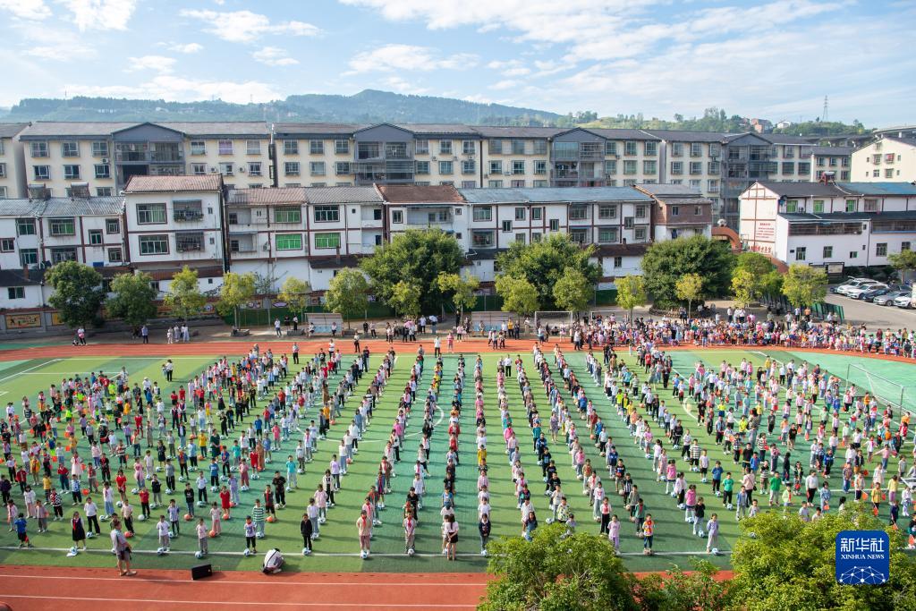 9月1日,在重庆市石柱县三河镇的三河小学,学生和老师参加开学典礼。