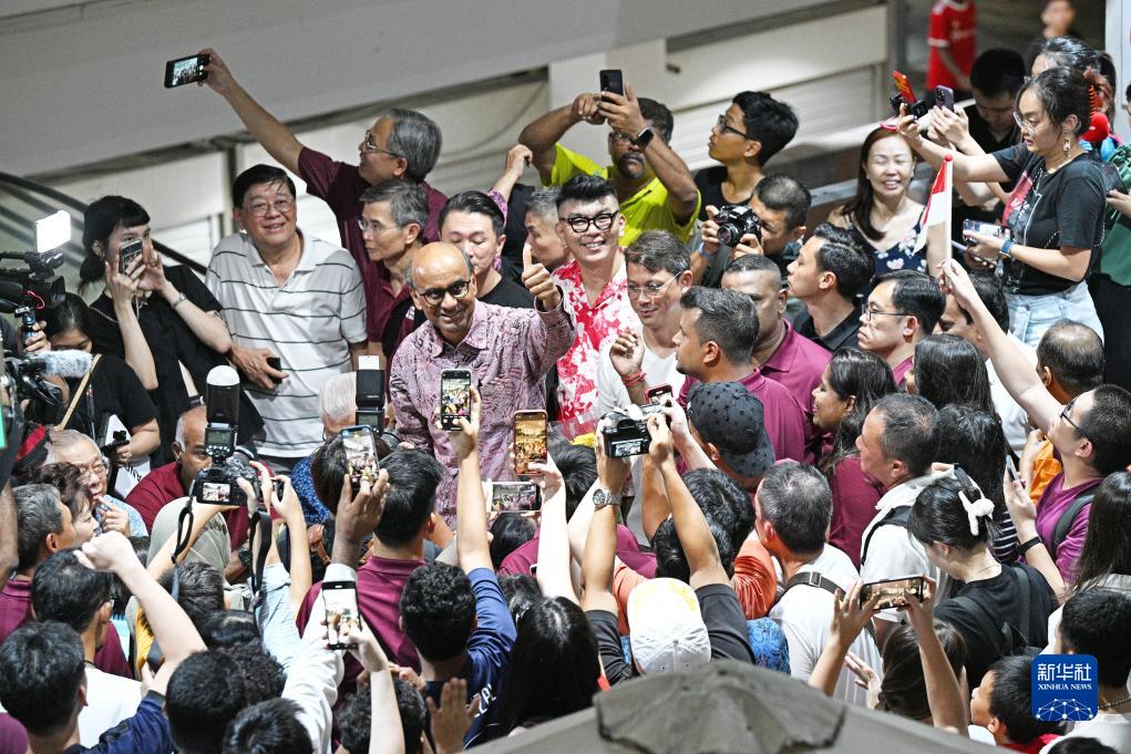 9月1日,新加坡总统候选人尚达曼(中)在裕廊等待总统选举结果揭晓时向支持者致意。