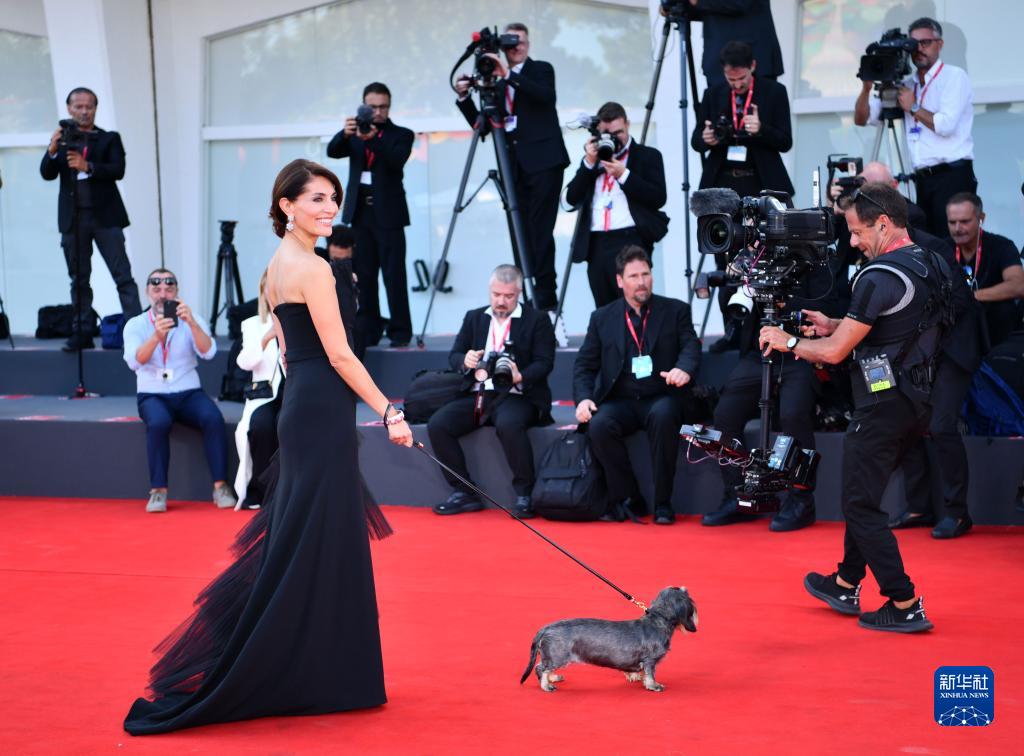 9月1日,在意大利威尼斯,演员卡泰丽娜·穆里诺牵着宠物狗亮相电影《可怜的东西》首映式红毯。