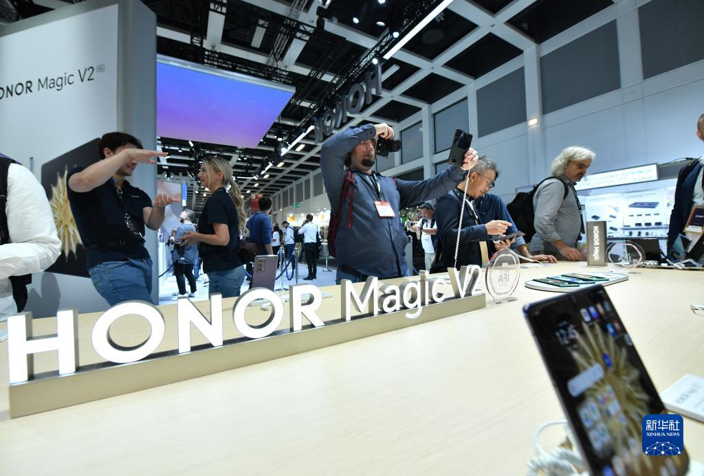9月1日,参观者在德国柏林国际消费电子展荣耀展区了解荣耀Magic V2折叠屏手机。