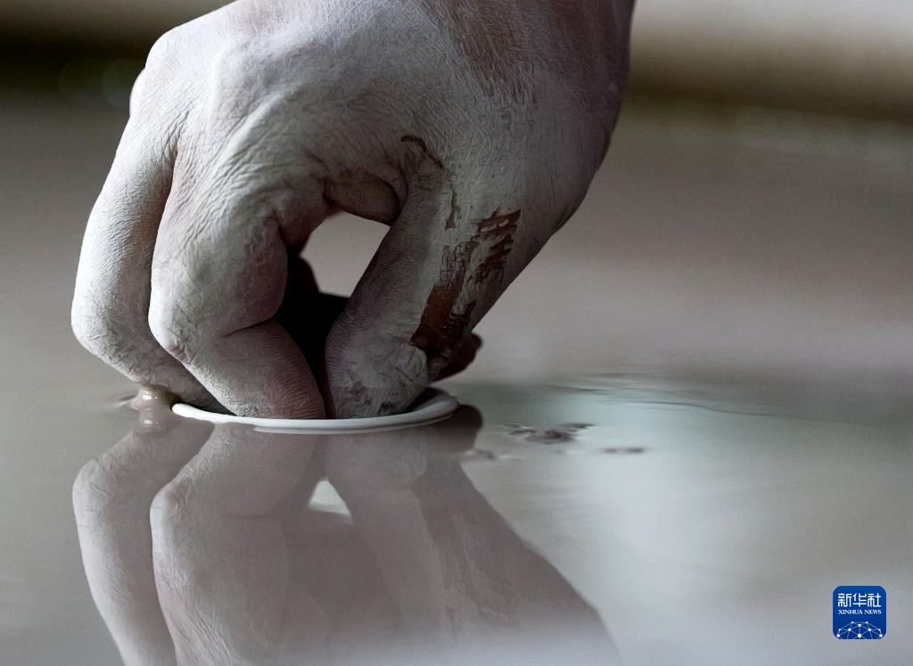 8月31日,在清凉寺村的一家汝瓷生产企业,汝瓷艺人王占稳在车间里施釉。