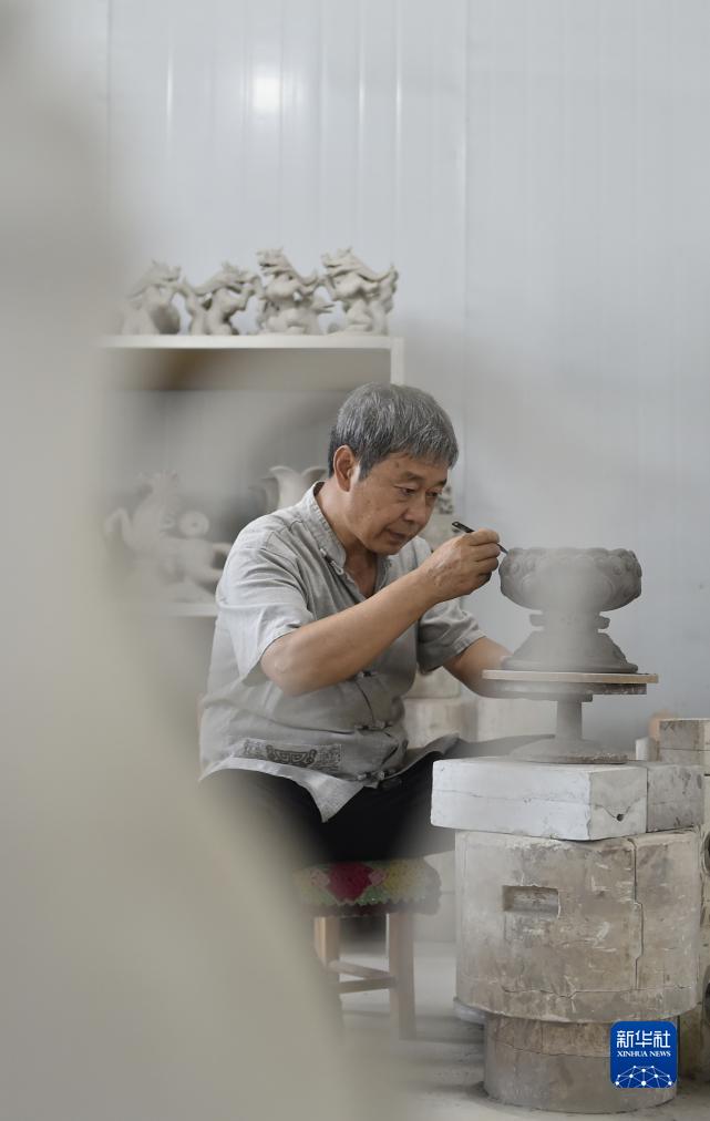 8月31日,在清凉寺村的一家汝瓷生产企业,汝瓷艺人王国奇在车间里修坯。