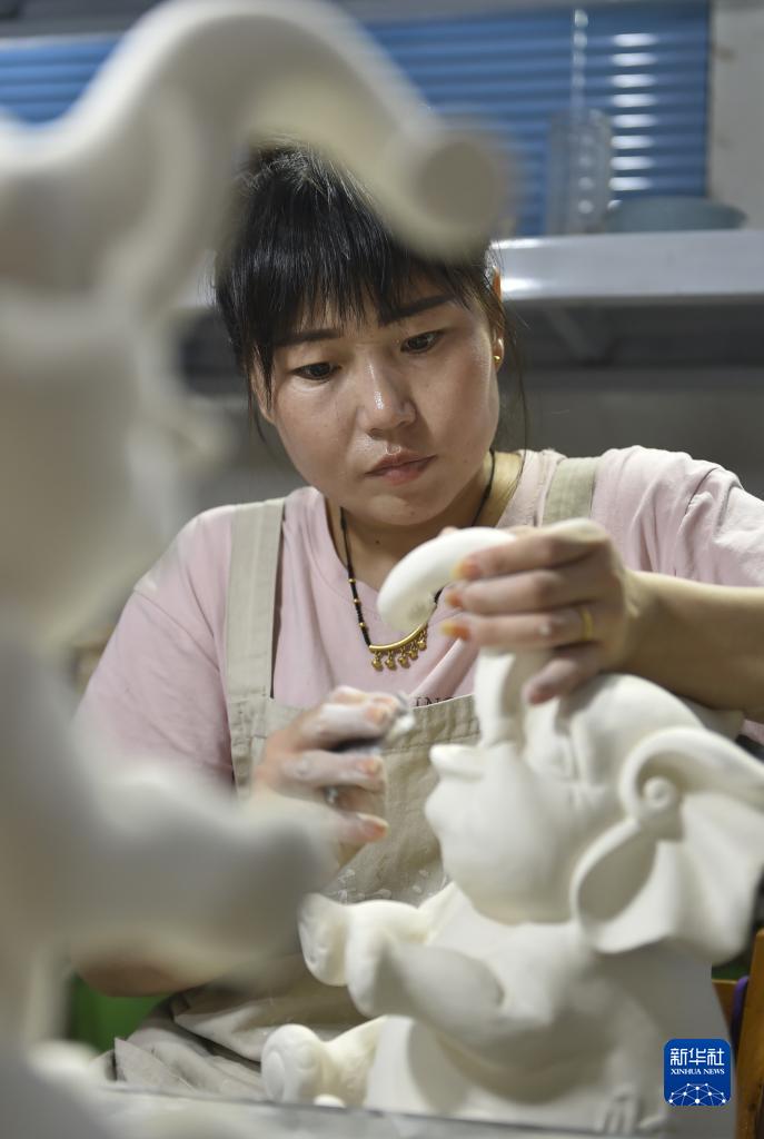 8月31日,在清凉寺村的一家汝瓷生产企业,工作人员在车间里修坯。
