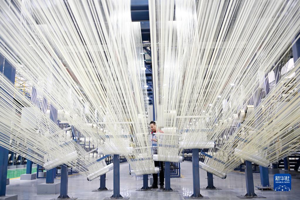 在中国建材集团西宁万吨碳纤维生产基地,工作人员在整理碳纤维原丝(8月27日摄)。