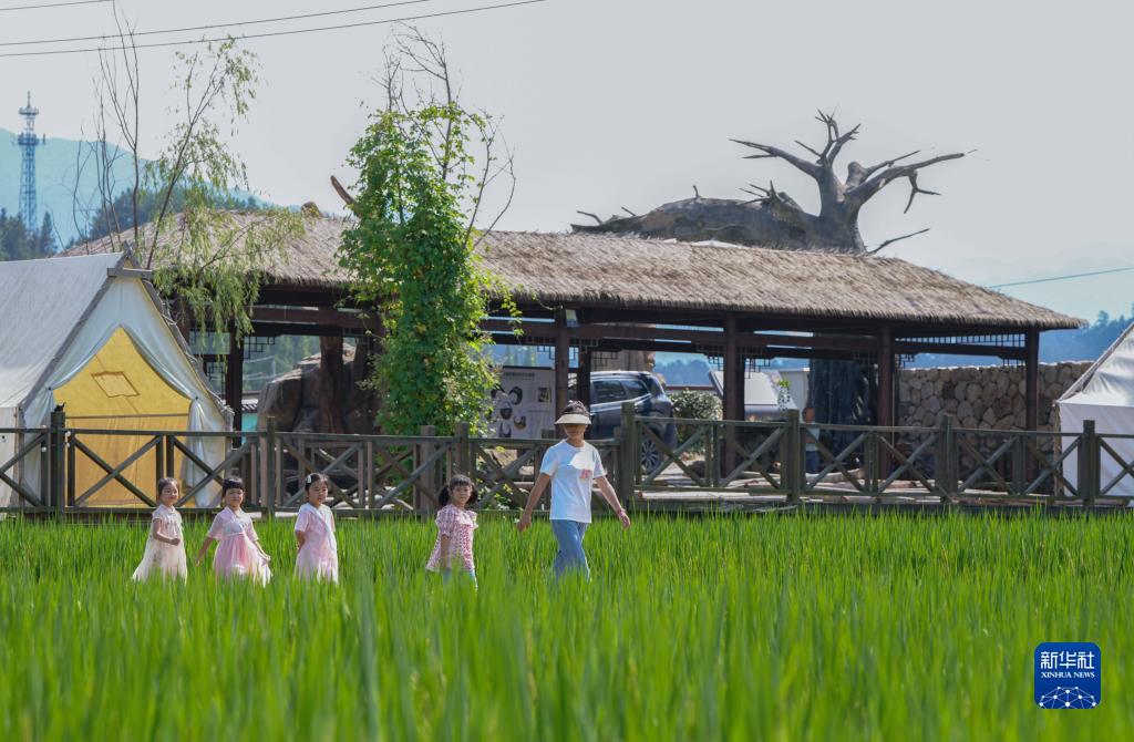 9月2日,太阳米基地的负责人陈梅芳(右)在给来太阳镇参加乡村研学游的小朋友讲解水稻种植知识。