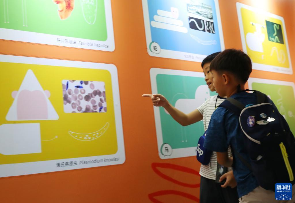 9月2日,小朋友在一个寄生虫知识展板前参观。