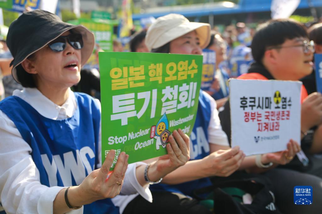当日,韩国多个市民团体在首尔市中心举行集会,抗议日本核污染水排海。