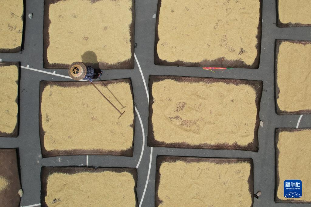 9月2日,在湖南省湘西土家族苗族自治州吉首市矮寨镇中黄村,农民在晾晒水稻(无人机照片)。