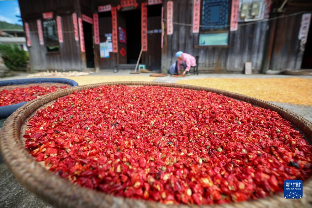 9月2日,村民在贵州省黔东南苗族侗族自治州丹寨县龙泉镇得禄村晾晒农作物。