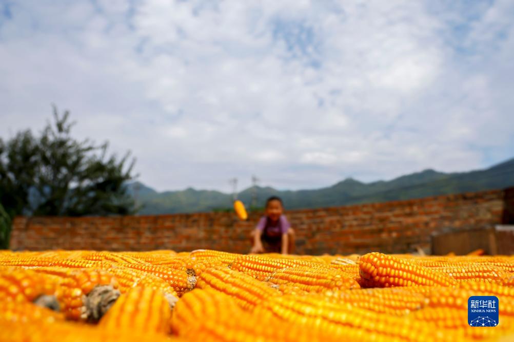 9月2日在贵州省黔南布依族苗族自治州罗甸县逢亭镇逢亭村拍摄的晾晒的玉米。