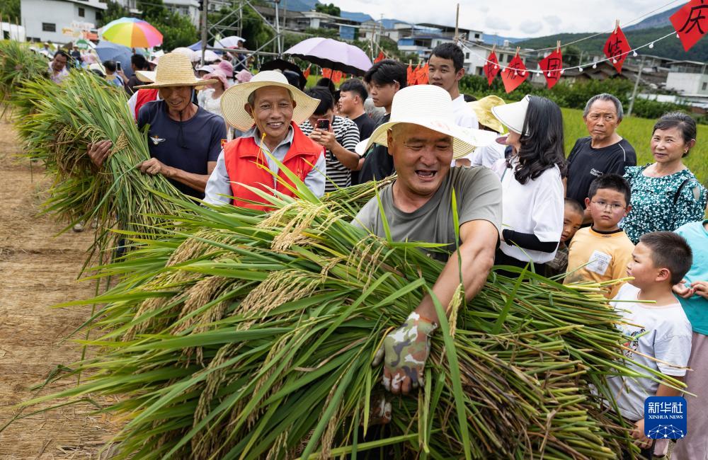 9月2日,在盐边县惠民镇兴隆村的稻田里,村民抱着收割后的水稻分享丰收的喜悦。