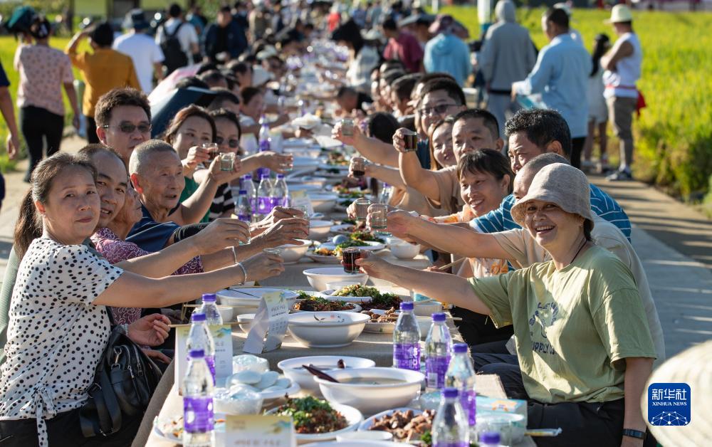 9月2日,在盐边县惠民镇兴隆村的稻田边,人们在丰收长桌宴上享用当地传统美食。