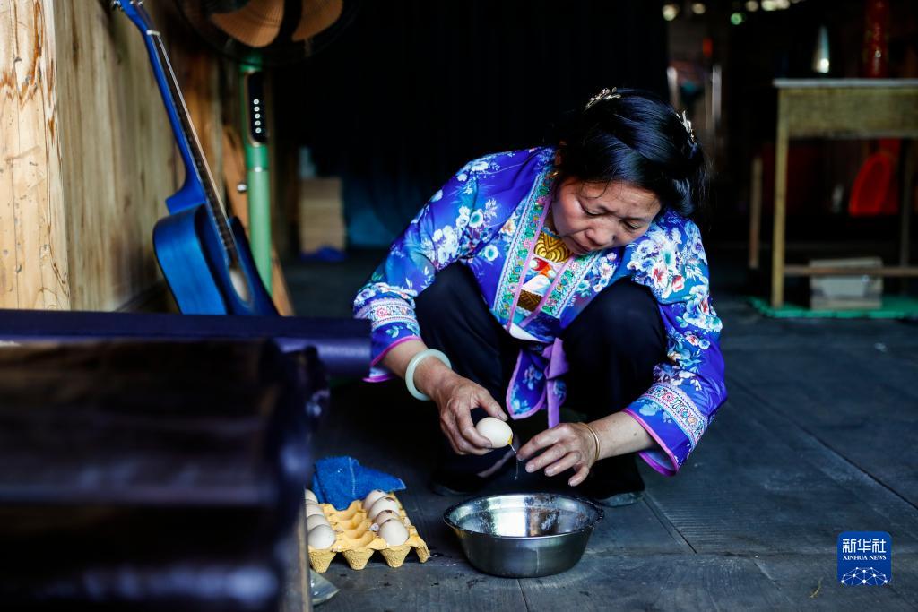 乌英苗寨妇女梁足英在取鸡蛋清,准备给布料涂抹(2023年8月30日摄)。新华社记者 胡星宇 摄
